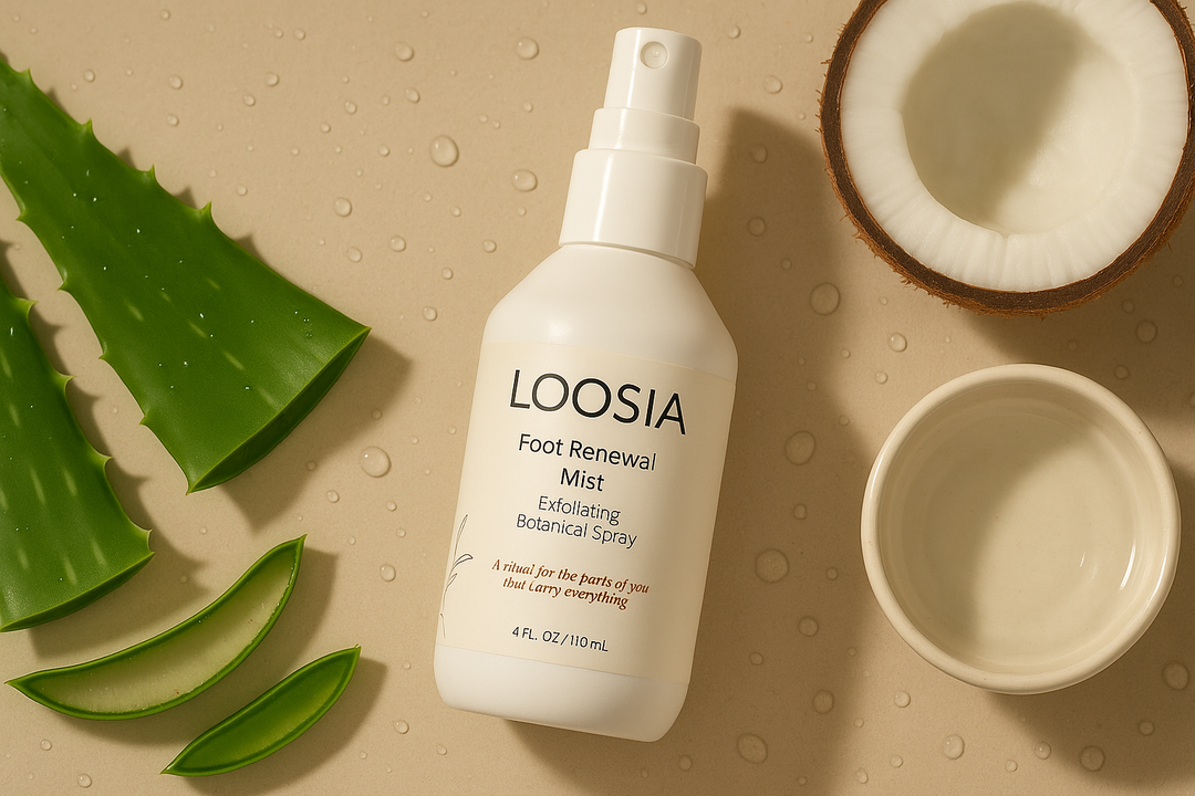 The Loosia Foot Renewal Spray™ is a gentle exfoliating mist that lifts away roughness and reveals the softness beneath.